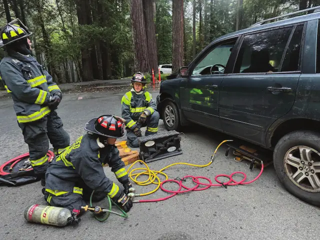 Air Lifting Bags: These bags can be deployed both with small and large sized bags for heavy object lifting. Once placed underneath an object, we inflate the bags with compressed air to lift objects between a few inches to a few feet. Once the object is raised to the desired level, we use lumber for cribbing and rescue struts to brace, to more securely stabilize the object, and help free trapped occupants.