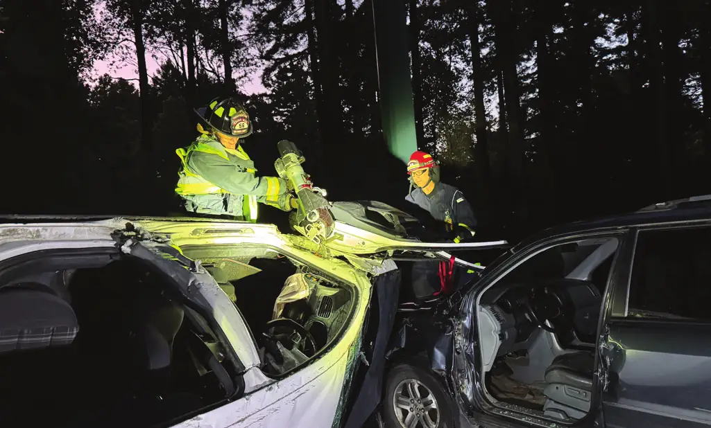 As one might imagine, with all these battery-powered tools, we run through a fair number of rechargeable batteries during an extended rescue. Our new rescue vehicle (R56) carries extra charged batteries, along with battery chargers, to keep us in business. Operating around these tools and vehicles can be dangerous for both the rescuers and vehicle occupants, with flying glass, metal shavings, unstable cars, and flying sparks. We operate with the upmost safety precautions and equipment for the rescuers and patients, both during training and real-life rescues.