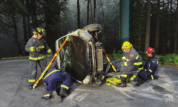 Stabilization Struts: If a vehicle lands on its side or remote locations which were, in the past, inaccessible on a hill after a vehicle collision, it can be both unstable for rescuers to enter a vehicle to provide medical aid and extraction for occupants trapped inside and also very dangerous for the patients trapped, if the car continues to move. Rescue struts can be quickly deployed to prop unstable vehicles, while securing the strut bases and tops with chains and high tension straps, both to the ground and vehicle.